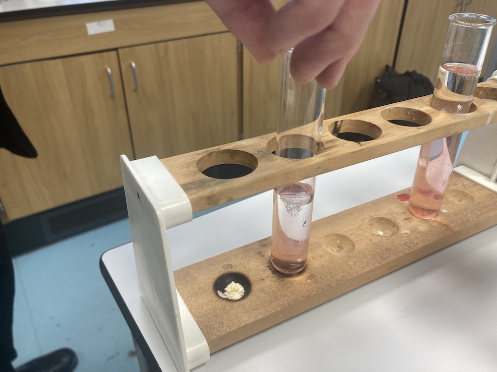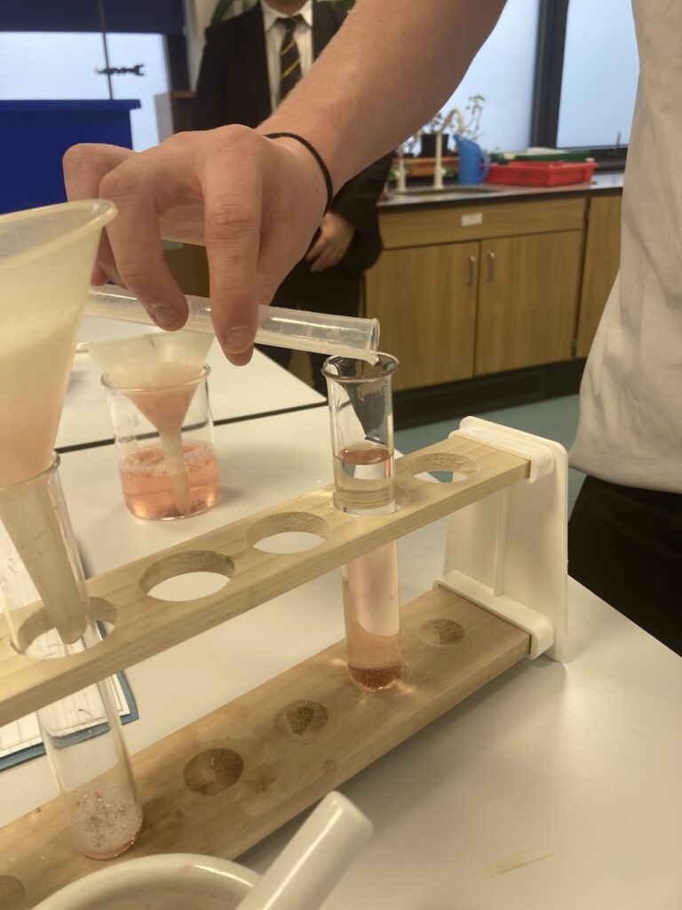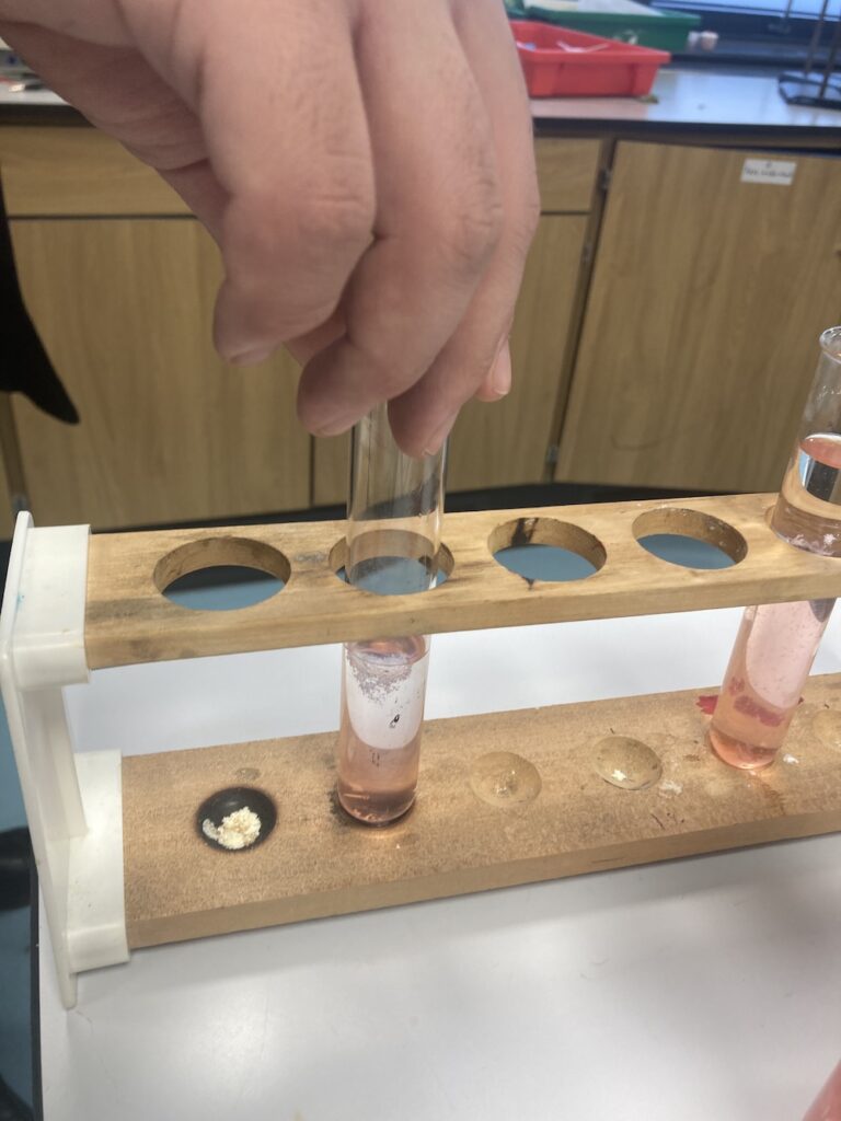 Last week Dr Patchett’s group drew links with their practical skills and knowledge of the structure of cells by extracting DNA from strawberries. We recapped the structure of a plant cell and used our knowledge of the other layers – the cellulose and cell wall and fatty cell membrane to break open the cell. We recapped the names of key equipment including, pestle and mortar, test tubes and pipettes. The results speak for themselves! Well done to all the pupils who took part in this task.