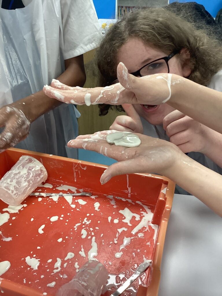 We have spent time developing our skills in all three sciences including making batteries, using microscopes and preparing slides, speeding up reactions using catalysis and measuring rates of reaction using the iodine clock reaction. We celebrated Halloween by making non-Newtonian fluids (slime!), bonfire night by carrying out flame tests and Christmas, well we won’t ruin the surprise in case anyone gets these as presents!